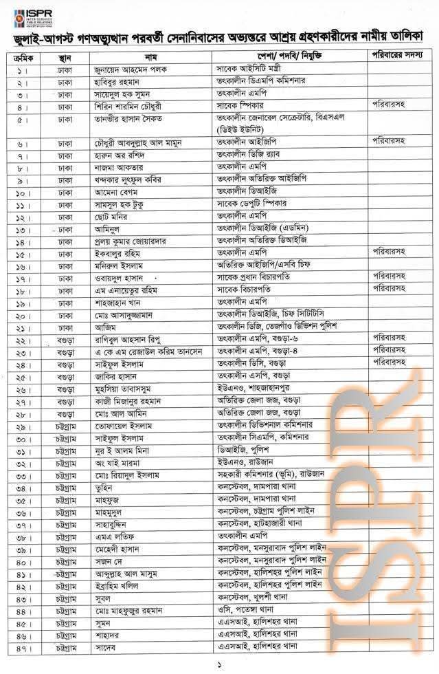 এ পরিপ্রেক্ষিতে জুলাই আগস্ট গণঅভ্যুত্থান পরবর্তী সেনানিবাসের অভ্যন্তরে প্রাণ রক্ষার্থে আশ্রয় গ্রহণকারী ৬২৬ জন ব্যক্তিবর্গের একটি পূর্ণাঙ্গ তালিকা (৪৩২ জন সাধারণ পুলিশ সদস্য ও ১ জন এনএসআই সদস্যসহ) এই প্রেস বিজ্ঞপ্তির সাথে সংযুক্ত করা হলো।